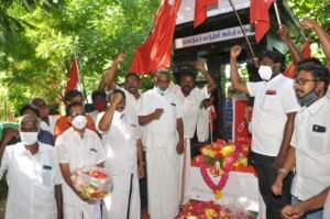 காந்தியடிகள் பிறந்த நாளை முன்னிட்டு திருச்சி அரசு மருத்துவமனை அருகே உள்ள மகாத்மா காந்தி அஸ்தி மண்டபத்தில் இந்திய கம்யூனிஸ்ட் கட்சியின் மாநில செயலாளர் முத்தரசன் மலர் தூவி மரியாதை செலுத்தினார்,