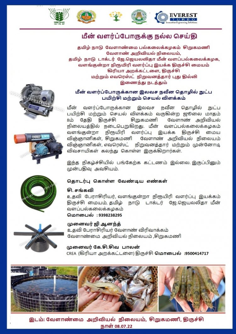 மீன் வளர்ப்போருக்கான இலவச நவீன தொழில் நுட்ப பயிற்ச்சி மற்றும் செயல் விளக்கம்வருகின்ற ஜூலை மாதம் 8ம் தேதி சிறுகமணி வேளாண்மை அறிவியல் நிலையத்தில் நடைபெற உள்ளது. மீன்வளப்பல்கலைக்கழகம் வளங்குன்றா நிரூயிரி வளர்ப்பு இயக்ககம் திருச்சி மைய விஞ்ஞானிகள், சிறுகமணி வேளாண் அறிவியல் நிலைய விஞ்ஞானிகள், எவரெஸ்ட் நிறுவனத்தார் மற்றும் முன்னோடி விவசாயிகள் கலந்து கொள்ள இருக்கிறார்கள்.