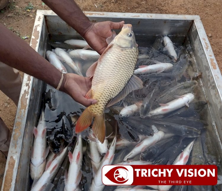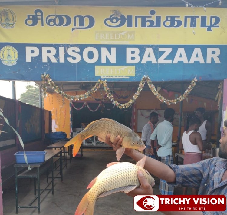 திருச்சி மத்திய சிறையில் சிறைக் கைதிகள் மற்றும் சிறைத்துறையினரால் சிறைச்சாலை தோட்டத்தில் உள்ள குளங்களில் வளர்க்கப்பட்ட சுமார் 60 கிலோ கெண்டை மீன்கள், திருச்சி சிறை அங்காடியில் விற்பனை செய்யப்பட்டு வருகிறது.
