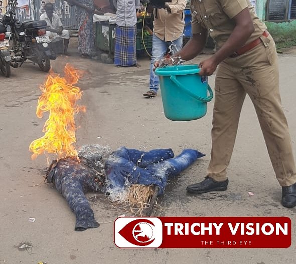 இதனைத் தொடர்ந்து திருச்சி மாவட்டத்தில் அந்தநல்லூா் ஒன்றியம் திருப்பராய்துறையில் அகில இந்திய போராட்ட ஒரு்ங்கிணைப்பு குழு சாா்பாக தமிழ்நாடு விவசாயிகள் சங்கத்தின் மாநில துணை தலைவா் K.முகமதலி தலைமையில் விவசாயிகள் உருவபொம்மை எாிப்பு போராட்டத்தை நடத்தினா்.