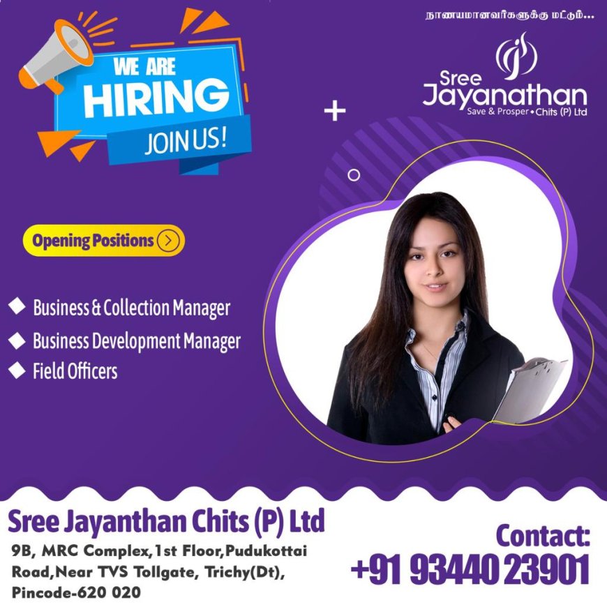 திருச்சி டிவிஎஸ் டோல்கேட் பகுதியில் செயல்பட்டு வரும் பிரபல ஸ்ரீ ஜெகநாதன் சிட்ஸ் பிரைவேட் லிமிடெட் நிறுவனத்தில் கீழ்கண்ட பணியிடங்களுக்கு வேலை வாய்ப்புகள் அறிவிக்கப்பட்டுள்ளன. மேலும் விபரம் மற்றும் தொடர்புக்கு கீழே உள்ள படத்தை பார்க்கவும்.