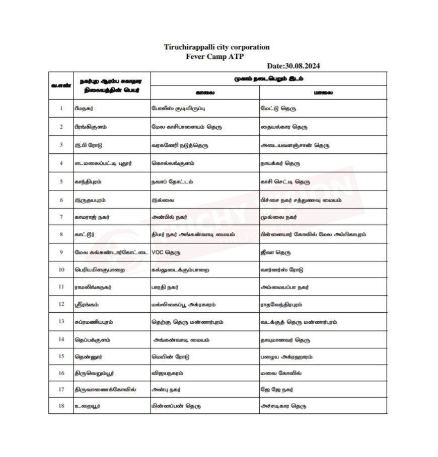 இந்த நிலையில் திருச்சி மாநகராட்சிக்கு உட்பட்ட பகுதிகளில் நாளை (31.08.2024) காய்ச்சல் முகாம் நடைபெறும் இடங்களை மாநகராட்சி அறிவித்துள்ளது.