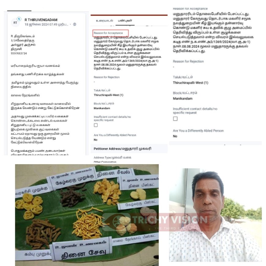 திருச்சி மாவட்டத்தில் உள்ள பல்வேறு பகுதிகளில் இருந்தும் காலை நேரங்களில் சத்திரம் பேருந்து நிலையத்திற்கு பள்ளி, கல்லூரி மாணவிகள் மற்றும் பொதுமக்கள் என பயணிகள் வருகை புரிகின்றனர். அதிகாலையில் இருந்தே பல்வேறு பணிகளுக்காக வரும் மக்கள் எண்ணைய் கலந்த பலகாரங்களை உணவாக எடுத்துகொள்வதை கவனத்தில் கொண்ட சமூக ஆர்வலர் அல்லூர் திருவேங்கடம் இதுகுறித்து முதலமைச்சர் தனிபிரிவிற்கு மனு அளித்துள்ளார்.