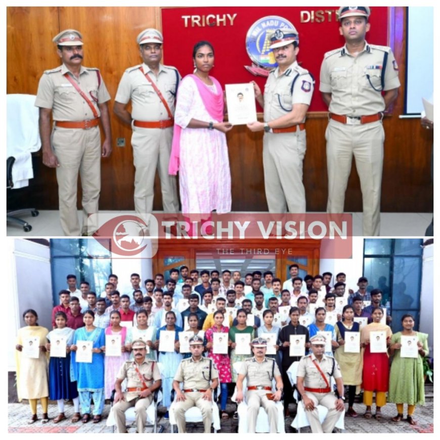 அப்போது, கானொலி காட்சி வாயிலாக திருச்சிராப்பள்ளி மாவட்டத்தில் உள்ள காவல் கண்காணிப்பாளர் அலுவலகத்தில் ம.மனோகர், காவல்துறைத் துணைத்தலைவர், திருச்சி சரகம் அவர்களால் 50 காவலர்களுக்கும், 19 தீயணைப்பாளர்களுக்கும் பணி நியமன ஆணை வழங்கப்பட்டது.