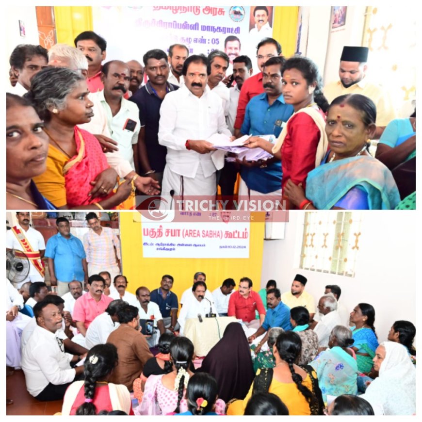 திருச்சிராப்பள்ளி மாநகராட்சி 65 வார்டு பகுதிகளிலும் துணை மேயர், மண்டல தலைவர்கள், மாமன்ற உறுப்பினர்கள், நகரப் பொறியாளர், செயற்பொறியாளர்கள், உதவி ஆணையர்கள், உதவி செயற்பொறியாளர்கள், இளநிலை பொறியாளர்கள், நிர்வாக அலுவலர்கள், உதவி வருவாய் அலுவலர்கள் ஆகியோர் முன்னிலையில் அந்தந்த வார்டுக்கு உட்பட்ட பகுதி சபா கூட்டம் நடைபெற்று பொதுமக்களிடம் பல்வேறு கோரிக்கை மனுக்களை பெற்றனர். தகுதியுள்ள மனுக்களுக்கு உரிய நடவடிக்கை எடுக்கப்படும் என தெரிவித்தார்.
