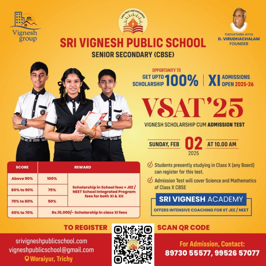 2025-26 ஆம் கல்வி ஆண்டு XI வகுப்பு சேர்க்கைக்கான கல்வி உதவித்தொகை தேர்வு நடைபெற உள்ளது. தற்போது பத்தாம் வகுப்பில் (எந்த வாரியத்திலும்) படிக்கும் மாணவர்கள் இந்தத் தேர்விற்கு பதிவு செய்யலாம். அட்மிஷன் டெஸ்ட் பத்தாம் வகுப்பு சிபிஎஸ்இயின் அறிவியல் மற்றும் கணிதத்தை உள்ளடக்கும்