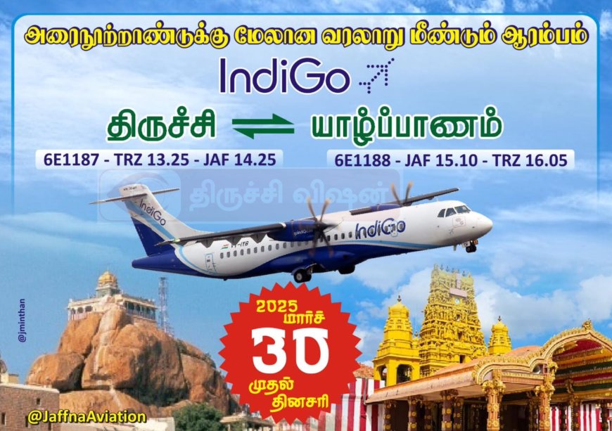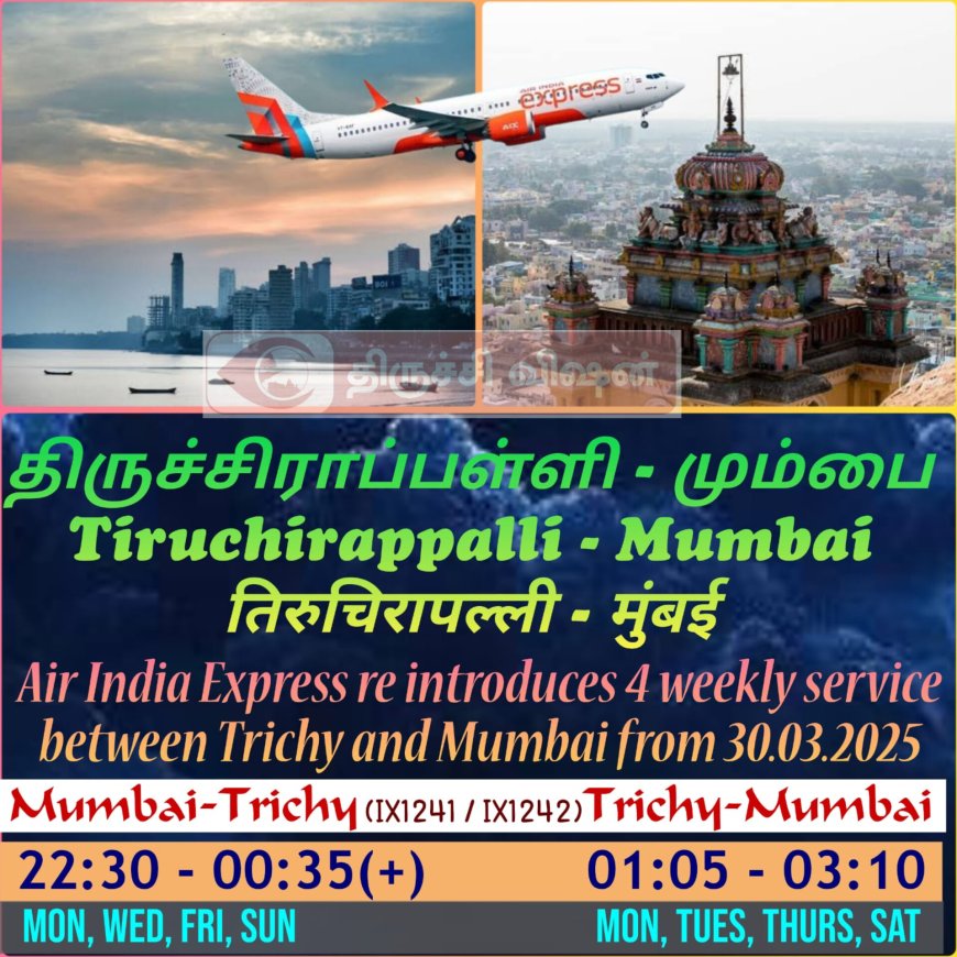 அதன்படி, கடந்த 14.02.2025 அன்று டெல்லியில் அமைந்துள்ள ஏர் இந்தியா எக்ஸ்பிரஸ் விமான போக்குவரத்து சேவை நிறுவன அதிகாரிகளை அவர்களின் அலுவலகத்தில் சந்தித்து, திருச்சிக்கு உள்நாட்டு போக்குவரத்து தொடர்பாக நான் கேட்டிருந்த விமான சேவைகளில் ஒன்றான, திருச்சி – மும்பை நேரடி விமான சேவை தொடங்கப்பட உள்ள அறிவிப்பை ஏர் இந்தியா எக்ஸ்பிரஸ் நிறுவனம் இன்று வெளியிட்டுள்ளது. அதுபோல, திருச்சி – யாழ்ப்பாணம் இண்டிகோ விமான சேவை தொடங்கப்படவுள்ள அறிவிப்பை அந்நிறுவனம் நேற்று வெளியிட்டது.இந்த இரண்டு புதிய விமான போக்குவரத்து சேவையும் எதிர்வரும் மார்ச் 30ஆம் தேதி தனது முதல் பயணத்தை தொடங்கும் என்றும், அதற்குரிய முன் பதிவு தொடங்கப்பட்டுள்ளது என்ற நற்செய்தியையும் தங்களுடன் பகிர்ந்து கொள்வதில் மக்கள் தொண்டனாக மகிழ்கிறேன்.