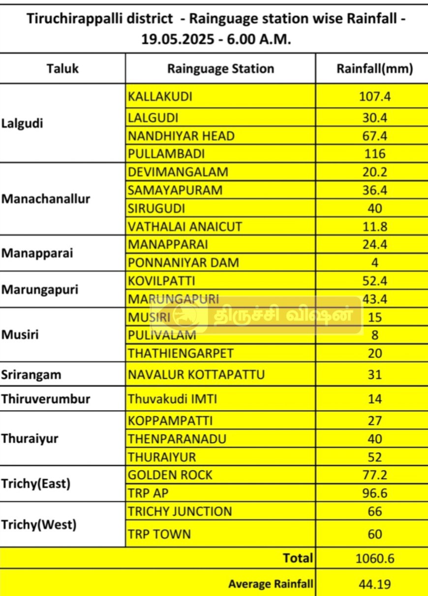 ஜங்ஷன் பகுதியில் 66 மில்லி மீட்டர், துவாக்குடி ஐ எம் டி ஐ பகுதியில் 14 மில்லி மீட்டர், கோல்டன் ராக் பகுதியில் 77.2 மில்லி மீட்டர், மழையின் அளவும் பதிவாகியுள்ளது நேற்று திருச்சி மாவட்டத்தில் பெய்த மழையின் மொத்த அளவு 1060.6 மில்லிமீட்டர் அளவு ஆகும்