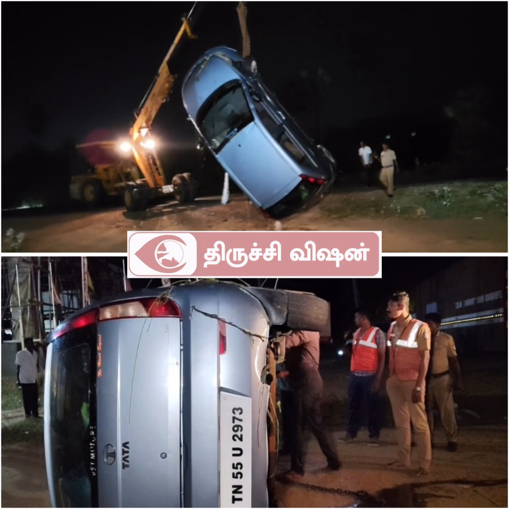 இந்த நிலையில் முருகன் தனது குடும்பத்தினருடன் சேலத்தில் உள்ள உறவினர் வீட்டிற்கு காரில் சென்றுவிட்டு நேற்று திருச்சிக்கு திரும்பி வந்துள்ளார்.காரை முருகன் ஒட்டியுள்ளார். பின் இருக்கையில் மனைவி மற்றும் பிள்ளைகள் அமர்ந்திருந்தனர்.திருச்சி மாவட்டம், துடையூர் அருகே நாமக்கல்-திருச்சி நெடுஞ்சாலையில் வந்தபோது திடீரென கார் கட்டுப்பாட்டை இழந்து சாலை ஓரத்தில் இருந்த அய்யன் வாய்க்காலுக்குள் பாய்ந்து விபத்துக்குள்ளானது.