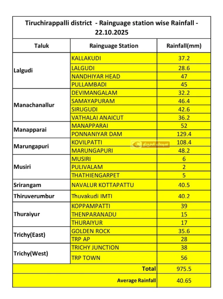 திருச்சிராப்பள்ளி மாவட்டத்தில் 22.10.2025 அன்று பதிவான மழை அளவுகள் குறித்த விவரங்கள் வெளியிடப்பட்டுள்ளன. மாவட்டத்தில் பதிவான மொத்த மழை அளவு 975.5 மி.மீ ஆக உள்ளதுடன், சராசரி மழை அளவு 40.65 மி.மீ ஆகும்.