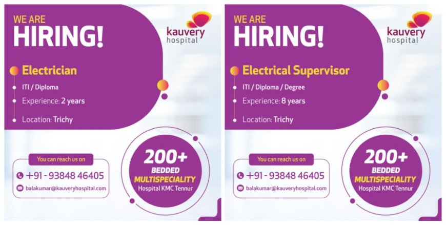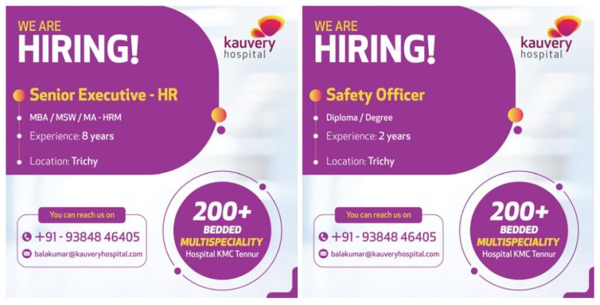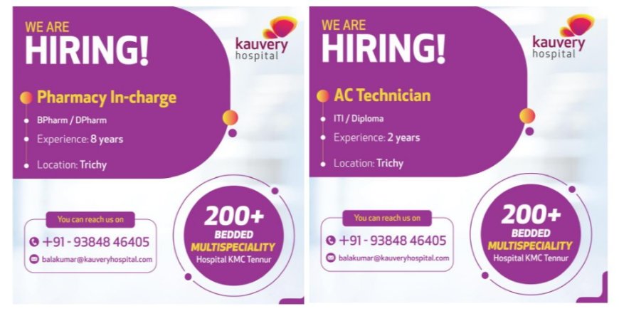 திருச்சியில் செயல்பட்டு வரும் பிரபல காவிரி மருத்துவமனையில் கீழ்கண்ட பல்வேறு பணியிடங்களுக்கு வேலைவாய்ப்புகள் அறிவிக்கப்பட்டுள்ளன. மேலும் விபரம் மற்றும் தொடர்புக்கு கீழே உள்ள படத்தை பார்க்கவும்.