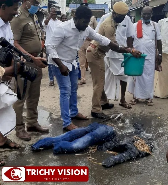 இதனைத் தொடர்ந்து திருச்சி மாவட்டத்தில் அந்தநல்லூா் ஒன்றியம் திருப்பராய்துறையில் அகில இந்திய போராட்ட ஒரு்ங்கிணைப்பு குழு சாா்பாக தமிழ்நாடு விவசாயிகள் சங்கத்தின் மாநில துணை தலைவா் K.முகமதலி தலைமையில் விவசாயிகள் உருவபொம்மை எாிப்பு போராட்டத்தை நடத்தினா்.