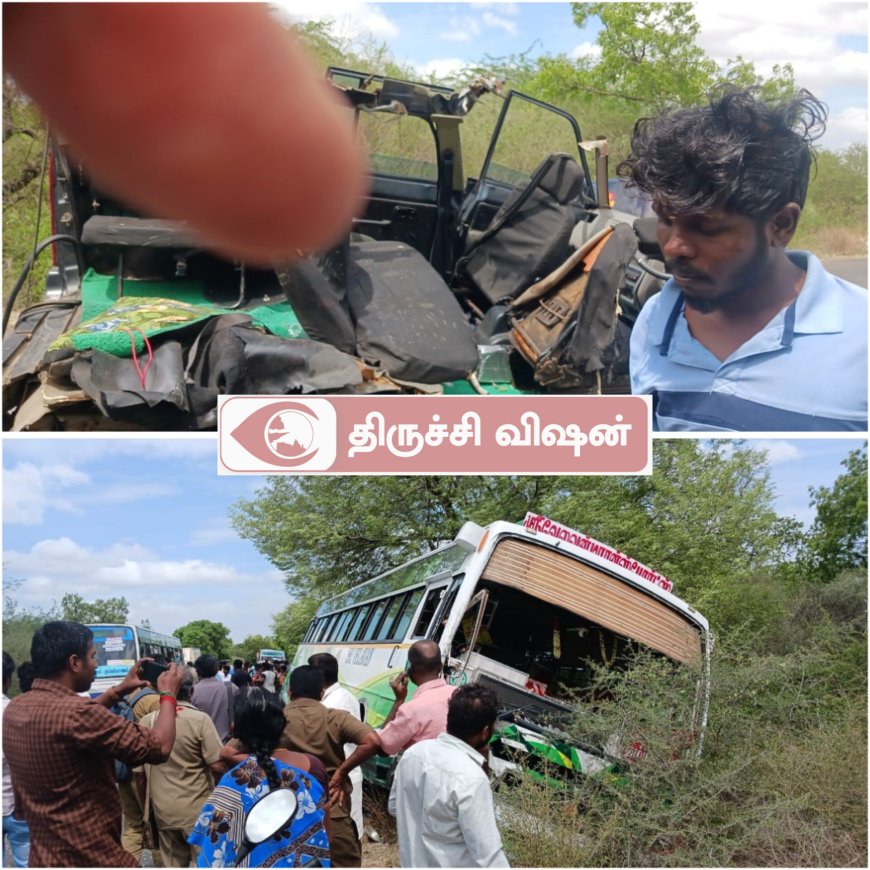 திருச்சி மாவட்டம், துறையூர் அருகே புலிவலம் வனப்பகுதியில் திருச்சி முதல் துறையூர் செல்லும் நெடுஞ்சாலையில் திருச்சியில் இருந்து துறையூர் நோக்கி வந்த தனியார் பேருந்தும், துறையூரிலிருந்து திருச்சி நோக்கி