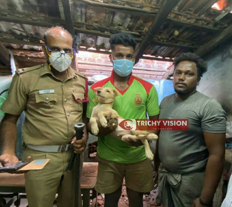 திருச்சி மேலகல்கண்டார் கோட்டை இந்திரா நகரைச் சேர்ந்தவர் தேவேந்திரன். இவரது வீட்டில் நாய் ஒன்று வளர்த்து வந்துள்ளார். இந்நிலையில் தேவேந்திரன் வீட்டுக்கு பக்கத்து வீட்டுக்கும் இடையே சுற்றுச்சுவர் மிகவும் குறுகியதாக உள்ளதால் அந்த நாய் எதிர்பாராதவிதமாக இரு சுவர்களுக்கு இடையே சிக்கிக் கொண்டது.