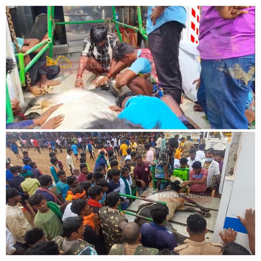 திருச்சி திருவளர்ச்சோலை பகுதியை சேர்ந்த சண்முகம் என்பவரது ஜல்லிக்கட்டு காளை மீது மற்றொரு காளை வேகமாக முட்டியது. ஆம்புலன்ஸ் வாகனத்தில் ஏற்றி சிகிச்சைக்கு அனுப்பி வைக்கும் வழியில் இறந்தது. கால்நடை மருத்துவர்கள் சிகிச்சை அளித்தும் பலன் இல்லாமல் இறந்து விட்டதாக தற்பொழுது தெரிவித்துள்ளனர். மாட்டின் உரிமையாளர், வளர்த்தவர்கள் அதன் மீது படுத்து கதறி அழுது வருகின்றனர்.