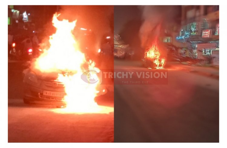 திருச்சி காட்டூர் கைலாஷ் நகரை சேர்ந்தவர் ராஜேஷ். இவர் ஆக்சிஸ் வங்கியில் மேலாளராக பணிபுரிந்து வருகிறார். இவர் குடும்பத்தினருடன்  காரில் ஆயில் மில் ரோடு சோதனைச் சாவடி அருகே வந்து கொண்டிருந்தபோது காரில் இருந்து புகை வந்துள்ளது. உடனடியாக காரை நிறுத்திய அவர் காரை விட்டு இறங்கி பார்த்தபோது தீ பிடித்து எரியத் தொடங்கியது. உடனடியாக காரில் இருந்தவர்கள் கீழே இறங்கினர்.