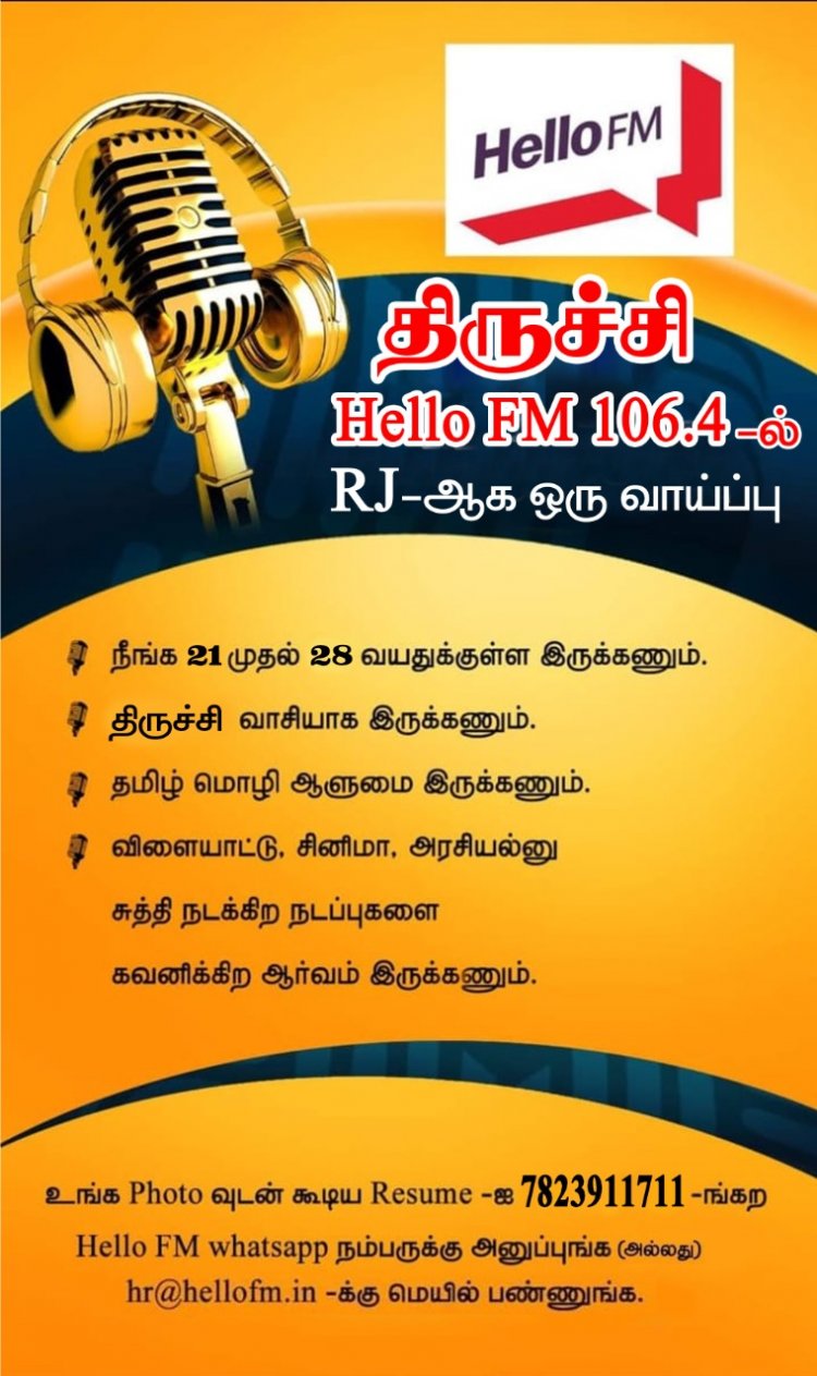 திருச்சி Hello FM 106.4ல் RJ ஆக ஒரு வாய்ப்பு