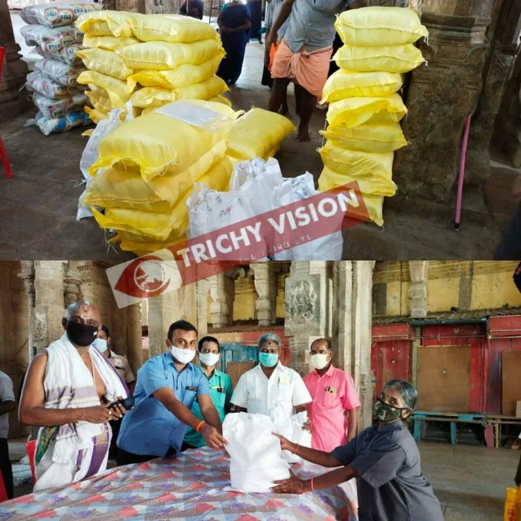 ஸ்ரீரங்கம் கோயில் ஒப்பந்த கொரானா பெருந்தொற்று காரணமாக தமிழகத்தில் ஊரடங்கு பிறக்பிக்கப்பட்டு சுமார் 1 மாத காலமாக வழிபாட்டுத்தலங்கள் திறக்கப்படாத காரணத்தினால் வாழ்வாதாரம் பாதிக்கப்பட்ட கோயிலில் பணிபுரியும் ஓப்பந்த பணியாளர்களுக்கு சென்னையை சேர்ந்த ஜோதி என்ற உபயதாரர் 300 ஒப்பந்த பணியாளர்களுக்கு நிவாரண பொருட்களை வழங்கி உள்ளார்.