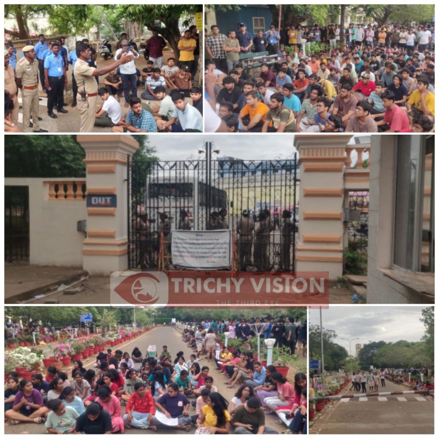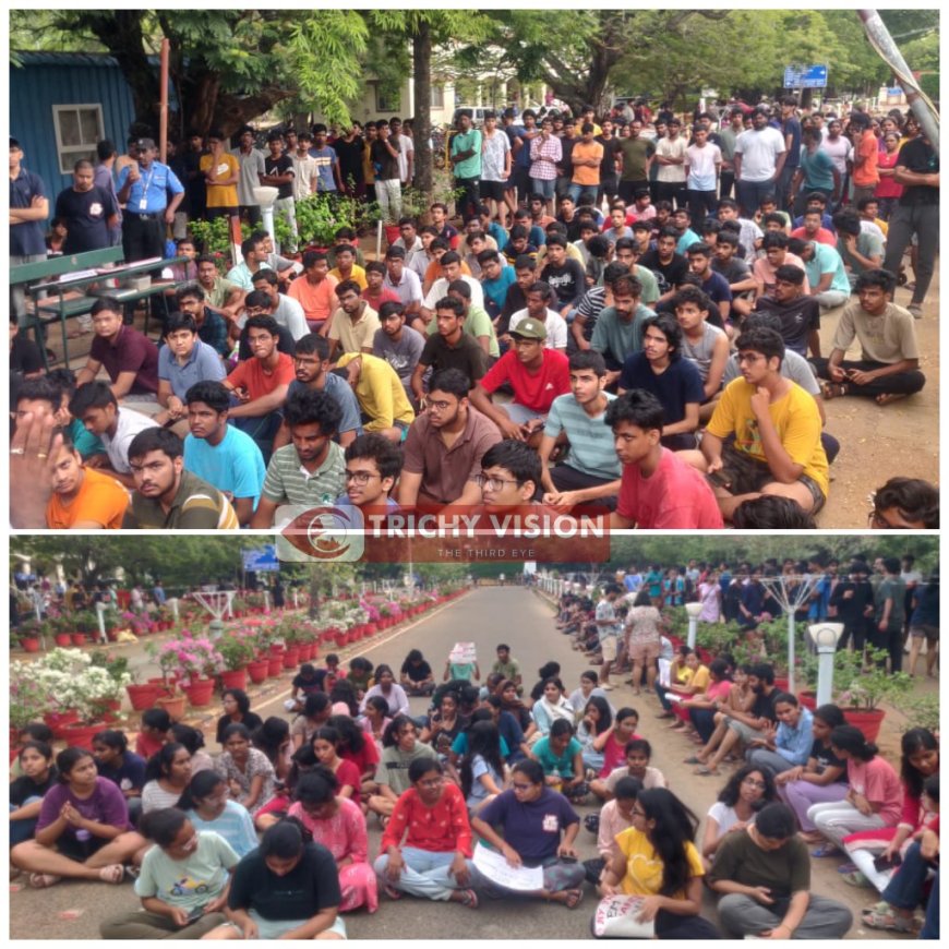 இந்த நிலையில் கல்லூரி நிர்வாகத்தின் அலட்சியப் போக்கையும், விடுதி வார்டனின் பொறுப்பின்மையையும் கண்டித்து சக மாணவ மாணவிகள் விடுதியின் முன் திரண்டு விடிய விடிய போராட்டத்தில் ஈடுபட்டுள்ளனர். இச்சம்பவம் குறித்து துவாக்குடி போலீசாருக்கு தகவல் கிடைத்ததும் சம்பவ இடத்திற்கு (பொறுப்பு) முசிறி டிஎஸ்பி சுரேஷ்குமார் மற்றும் துவாக்குடி போலீசார் விரைந்து சென்று சம்பந்தப்பட்ட மாணவ அவர்களிடம் பேச்சுவார்த்தையில் ஈடுபட்டு வருகின்றனர். இதனால் என் ஐடி கல்லூரி வளாகத்திற்குள் பெரும் பரபரப்பு ஏற்பட்டுள்ளது