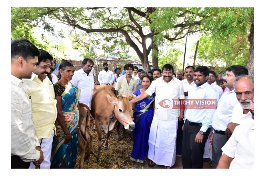 திருச்சிராப்பள்ளி ஸ்ரீரஙகம் அரங்கநாதர் திருக்கோயில் கோசாலையில் பராமரிக்கப்பட்டு வந்த கன்றுடன் கூடிய 35 பசு மாடுகளை பச்சமலைவாழ் மகளிர் சுய உதவிக் குழுவினருக்கு நகராட்சி நிருவாகத்துறை அமைச்சர் கே.என்.நேரு வழங்கினார்.
