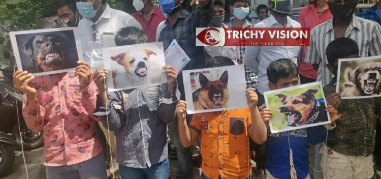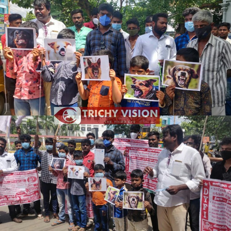 இந்நிலையில் பொதுமக்களை கடித்து உயிருக்கு ஆபத்தை விளைவிக்கும் தெரு நாய்களின் எண்ணிக்கையை தடுத்திட கோரி இந்திய ஜனநாயக வாலிபர் சங்கத்தினர் திருச்சி மாநகராட்சி அலுவலகத்தினுள் நாய் விடும் போராட்டம் நடத்துவதாக அறிவித்தனர். இதற்காக மாநகராட்சி அலுவலகம் முன்பு கூடியிருந்த இந்திய ஜனநாயக வாலிபர் சங்கத்தினர் நாய்களின் புகைப்படத்தை வைத்துக் கொண்டு கண்டன கோஷங்களை எழுப்பினர்.