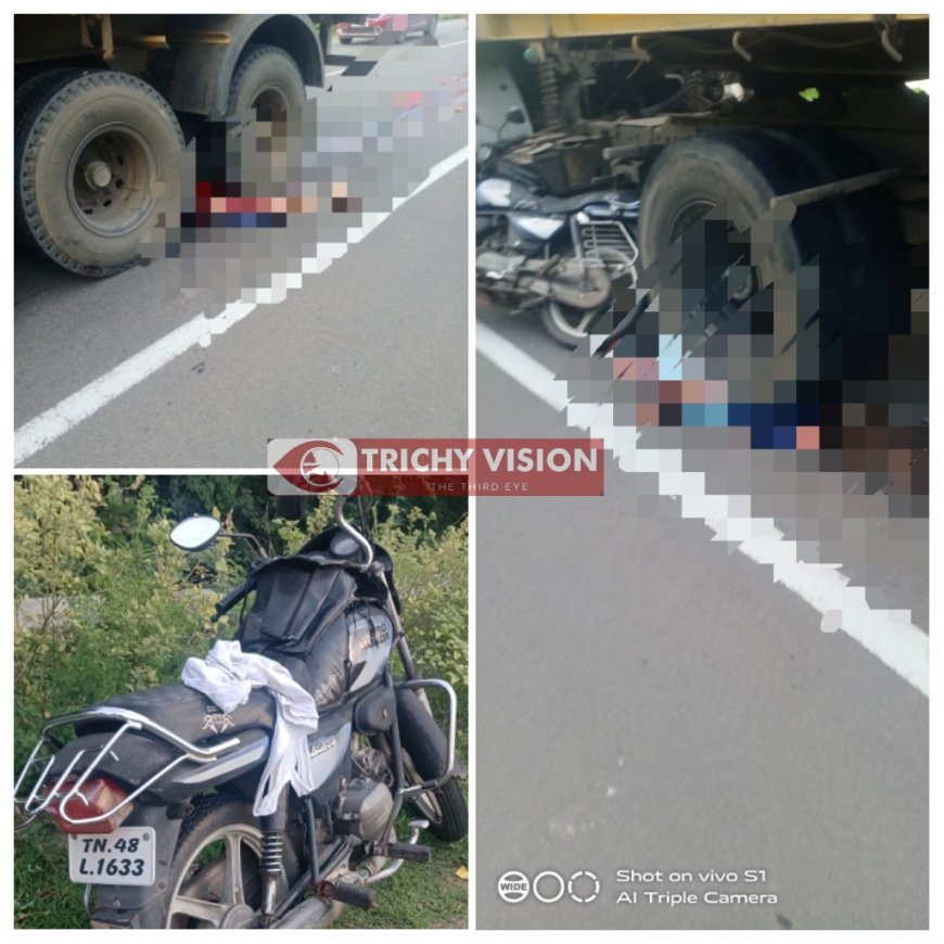 திருச்சியில் இருந்து கம்பி ஏற்றி கொண்டு கர்நாடகா நோக்கி சென்று கொண்டிருந்தது. அப்போது திருச்சி – கரூர் தேசிய நெடுஞ்சாலை ஜீயபுரம் பகுதி அல்லூர் அருகே சென்று கொண்டிருந்த போது திருச்சி மாவட்டம் பெட்டவாய்த்தலை வைகோ நகரை சேர்ந்த மூர்த்தி (41) அவரது மகள் தர்ஷினி, மகன் குருசரண் ஆகிய மூன்று பேரும் இருசக்கர வாகனத்தில் சென்றனர்.