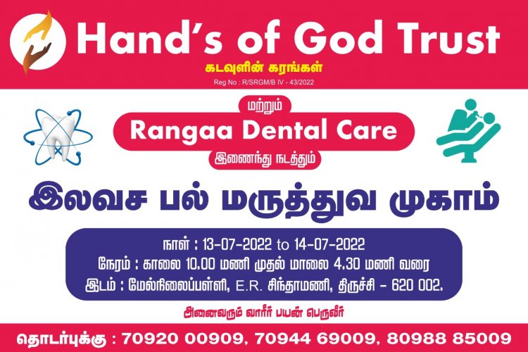 கடவுளின் கரங்கள் டிரஸ்ட் மற்றும் ரங்கா டெண்டல் கேர் இணைந்து நடத்தும் இலவச பல் மருத்துவ முகாம் நாளை (13.07.2022) காலை 10 மணி முதல் 4 மணி வரை திருச்சி சிந்தாமணி E.R.மேல்நிலைப்பள்ளியில் நடைபெறுகிறது.