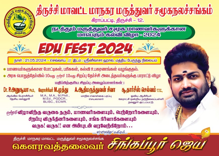 திருச்சி மாவட்ட மாநகர மருத்துவர் சமூக நல சங்கம் சார்பில் நாளை (21.05.2024) மருத்துவர் சமூக மாணவர்களுக்கான மாபெரும் கல்வி விழா நடைபெற உள்ளது. திருச்சி மத்திய பேருந்து நிலையம் அருகில் உள்ள சீனிவாச மஹாலில் இந்த விழாவானது நடைபெற இருக்கிறது.