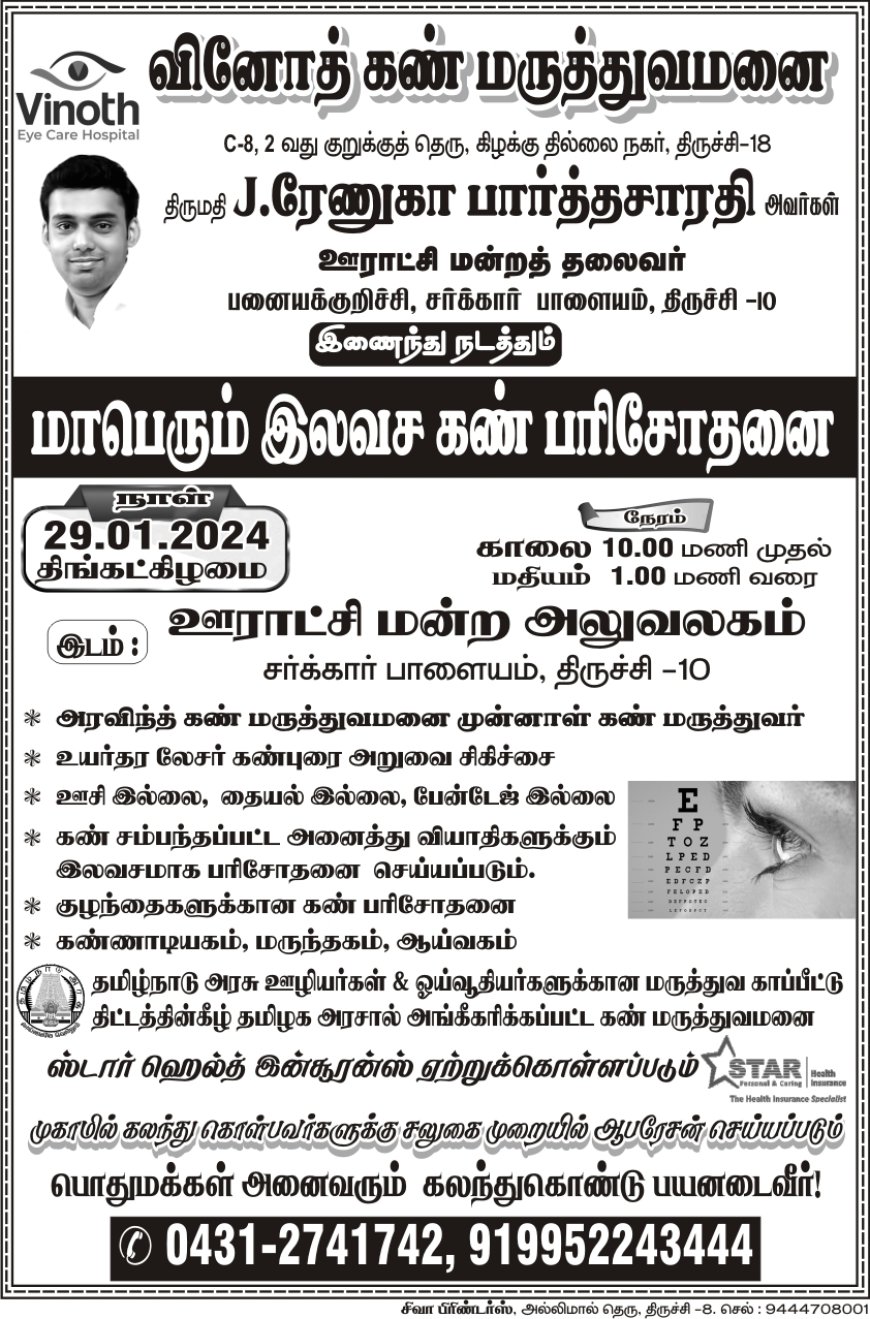 திருச்சி வினோத் கண் மருத்துவமனை மற்றும் சர்க்கார் பாளையம் பனையக்குறிச்சி ஊராட்சி மன்ற தலைவர் ரேணுகா பார்த்தசாரதி இணைந்து நடத்தும் மாபெரும் இலவச கண் பரிசோதனை முகாம் நாளை (29.01.2024) நடைபெற உள்ளது.