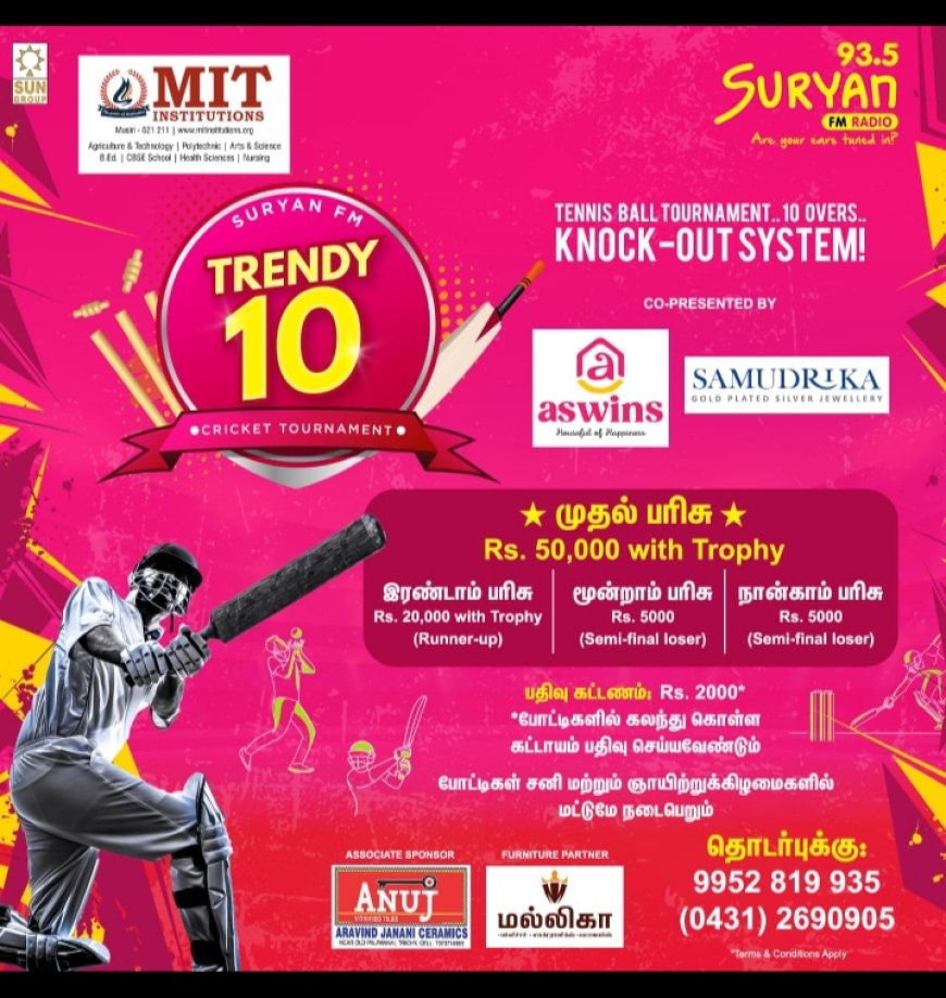 திருச்சி சூரியன் எப்எம் வழங்கும் Trendy10 கிரிக்கெட் போட்டி. 10 ஓவர் கிரிக்கெட் போட்டி சனி மற்றும் ஞாயிறு கிழமைகளில் நடைபெற உள்ளது.