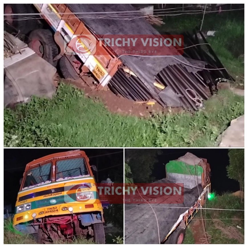 திருச்சி அரியமங்கலம் கல்லாங்குத்து பகுதியில் உள்ள இரும்பு பைப்பு குடோனில் இருந்து பைப்புகளை ஏற்றிக் கொண்டு கும்பகோணம் நோக்கி புறப்பட்டது. இதனை திருச்சி திருவானைக்கோவில் நடுகொண்டையம்பேட்டையை சேர்ந்த பிரபு என்பவர் ஓட்டி வந்தார்.