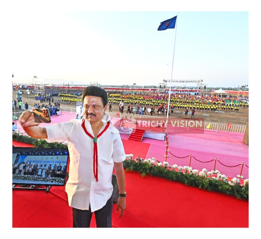 திருச்சி மாவட்டம், மணப்பாறை சிப்காட்டில் கடந்த மாதம் 28 ஆம் தேதி முதல் பிப்ரவரி 3 ஆம் தேதி வரை பாரத சாரண, சாரணியர் இயக்க வைர விழா மற்றும் கலைஞர் நூற்றாண்டு பெருந்திரளணி நிகழ்வு நடைபெற்று வருகிறது. இன்று (03.02.2024) நிகழ்வு நிறைவு பெறும் நிலையில் நேற்று (02.02.2024) விழாவின் நிறைவு விழா நடைபெற்றது. இந்த விழாவில் தமிழ்நாடு முதலமைச்சர் மு.க.ஸ்டாலின் கலந்து கொண்டார். நிகழ்வு நடைபெறும் இடத்திற்கு வந்த முதலமைச்சருக்கு பள்ளி கல்வி துறை அமைச்சர் அன்பில் மகேஷ், சாரண, சாரணியர், அதிகாரிகள் உள்ளிட்டோர் வரவேற்றனர்.