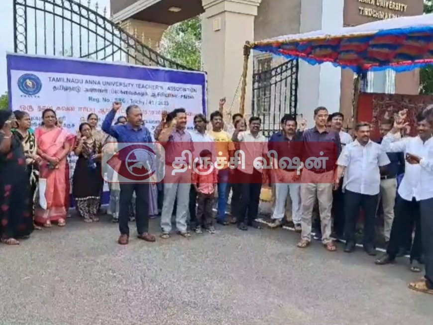 தமிழ்நாடு அண்ணா பல்கலைக்கழக ஆசிரியர்கள் சங்கம் சார்பில் 15 ஆண்டுகளாக வழங்கப்படாமல் உள்ள பதவி உயர்வை உடனடியாக வழங்க வேண்டும் என்ற கோரிக்கையை வலியுறுத்தி திருவெறும்பூர் அருகே உள்ள அண்ணா பல்கலைக்கழகத்தில் பேராசிரியர்கள் ஒரு நாள் கவன ஈர்ப்பு ஆர்ப்பாட்டம் நடத்தினர்.