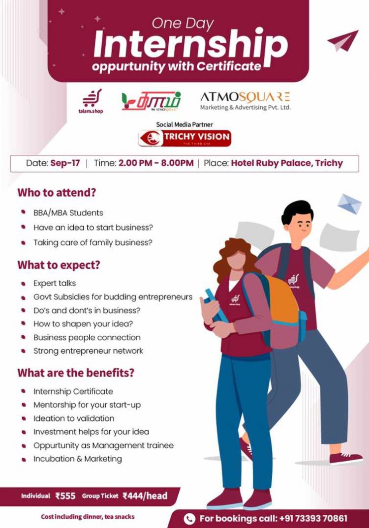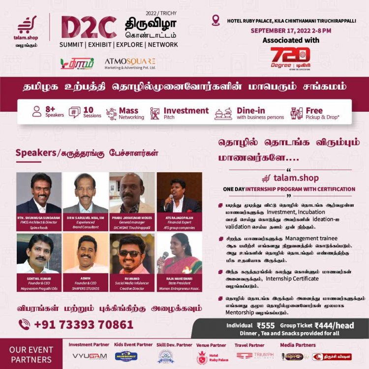 திருச்சியில் குறு சிறு உற்பத்தியாளர்களின் நேரடி விற்பனை பொருட்காட்சி நடைபெற உள்ளது அதன் ஒரு பகுதியாக talam.shop ஒரு நாள் கருத்தரங்கு தொழில் தொடங்க நினைக்கும் மாணவர்களுக்கான பயிலரங்கத்தை செப்டம்பர் 17ஆம் தேதி நடத்த திட்டமிட்டுள்ளனர். இது குறித்து மேலும் விவரங்களுக்கு கீழ் உள்ள படத்தை காணவும்.