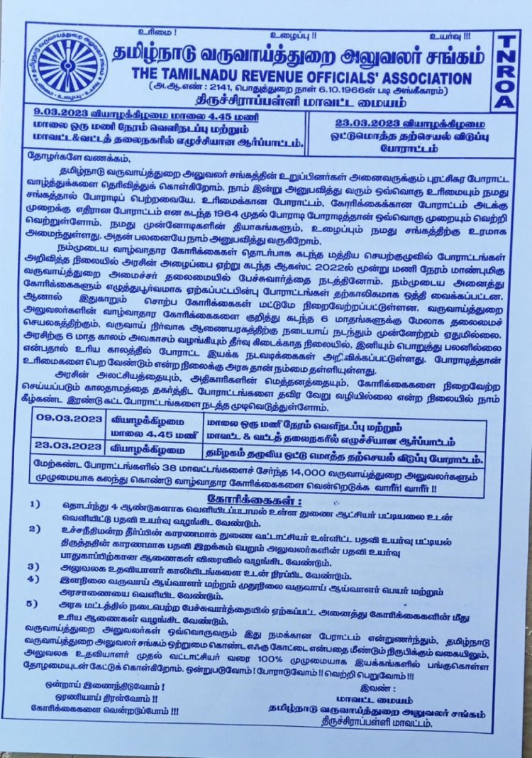 தமிழ்நாடு வருவாய்த்துறை அலுவலர்கள் சங்கம் சார்பில் தொடர்ந்து நான்கு ஆண்டுகளாக வெளியிடப்படாமல் உள்ள துணை ஆட்சியர் பட்டியலை உடன் வெளியிட்டு பதவி உயர்வு வழங்கிட வேண்டும் உள்ளிட்ட பல்வேறு கோரிக்கைகளை வலியுறு த்தி 50க்கும் மேற்பட்டோர் ஆட்சியர் அலுவலகம் முன்பு எப்பொழுது ஆர்ப்பாட்டத்தில் ஈடுபட்டு வருகின்றனர்.
