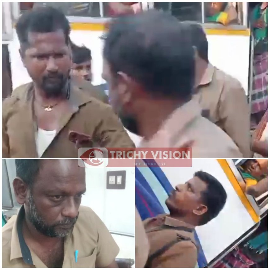 திருச்சி மத்திய பேருந்து நிலையத்தில் இலுப்பூர் வழியாக பொன்னமராவதி செல்லும் அரசு பேருந்தும், தனியார் பேருந்தும் நின்று கொண்டிருந்தது. முன்னதாக தனியார் பேருந்து பயணிகளை ஏற்றி கொண்டு செல்ல தயாராக இருந்தது. அப்போது பயணி ஒருவர் சந்தேகத்தை கேட்க அரசு பேருந்து நடத்துனரிடம் வந்தார். இதனால் தனியார் பேருந்து நடத்தினருக்கும், அரசு பேருந்து நடத்துனருக்கும் வாக்குவாதம் ஏற்பட்டுள்ளது.