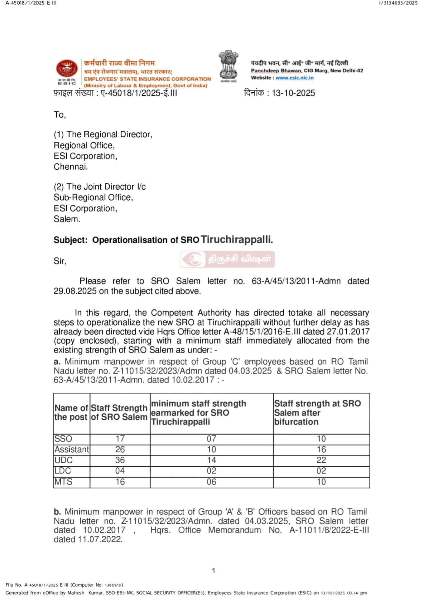 9 ஆண்டுகள் தேக்கத்தில் இருந்த திட்டம் நிறைவேற்றம் – திருச்சியில் புதிய ESIC மண்டல துணை அலுவலகம் அமைப்பது உறுதி
