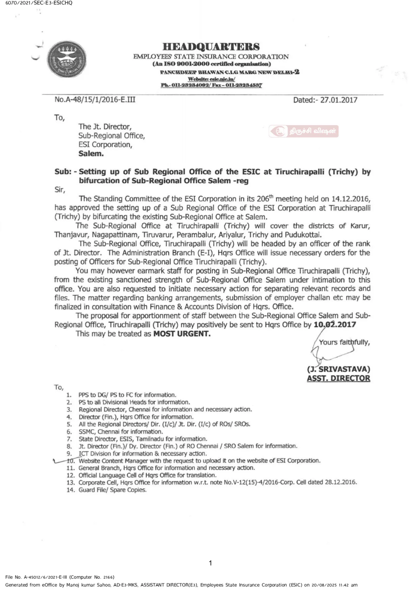 கடந்த ஒன்பது ஆண்டுகள் தேக்க நிலையில் இருந்த ESIC திருச்சி மண்டல துணை அலுவலகம் அமைக்கும் பணிக்கான எனது தொடர் முயற்சி வென்றுள்ளது.