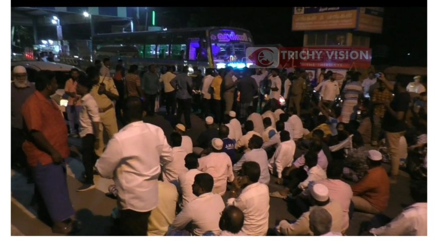இதற்கிடையில் சம்பந்தப்பட்ட இடத்தில் யாரும் பிரவேசிக்க கூடாது என்பதற்காக போலீசார் கூடுதலாக பாதுகாப்பு பணியில் ஈடுபட்டு வருகின்றனர். இதனையடுத்து திடீரென இரவு சுமார் 10:20 மணியளவில் திருச்சி – தஞ்சை தேசிய நெடுஞ்சாலை திருவெறும்பூர் பேருந்து நிலையத்தில் திடீரென திருவெறும்பூர் தாசில்தாரை கண்டித்து சாலை மறியல் போராட்டத்தில் ஈடுபட்டனர். இதனால் பரபரப்பு ஏற்பட்டது.