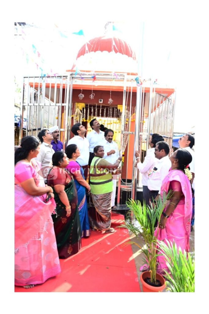 கடந்த 1953 ஆம் ஆண்டு திருச்சிராப்பள்ளி காந்தி சந்தையில் அமைக்கப்பட்ட, மகாத்மா காந்தியின் உருவ சிலைக்கு, மாலை அணிவித்து, மரியாதை செலுத்தி விட்டு, அருகில் இருந்த தேசிய கொடி கம்பத்தில், மாநகராட்சி மேயர் அன்பழகன், மாநகராட்சி ஆணையர் சரவணன், துணை மேயர் திவ்யா ஆகியோர் முன்னிலையில், திருச்சிராப்பள்ளி மாநகராட்சி தூய்மை பணியாளர் சுமதி தேசியக்கொடியை ஏற்றி வைத்து மரியாதை செலுத்தினார்.