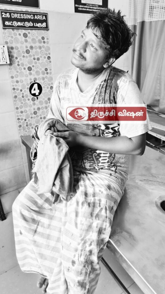 அவர்களை ஏன் இப்படி வருகிறீர்கள் என முகமது உசேன் கேட்டுள்ளார். இதனால் ஆத்திரம் அடைந்த அவர்களில் ஒருவன் மறைத்து வைத்திருந்த அருவாளை எடுத்து முகமது உசேனின் கை மற்றும் தோள்பட்டை ஆகிய இரண்டு இடத்தில் வெட்டி விட்டுதப்பி ஓடிவிட்டனர்.இதில் பலத்த காயமடைந்த முகமது உசேனை அப்பகுதி மக்கள் மீட்டு துவாக்குடி அரசு மருத்துவமனையில் முதல் கட்ட சிகிச்சையும் பின்னர் முயற்சிகிச்சைக்காக திருச்சி அரசு மருத்துவமனைக்கும் அனுப்பி வைத்தனர்.