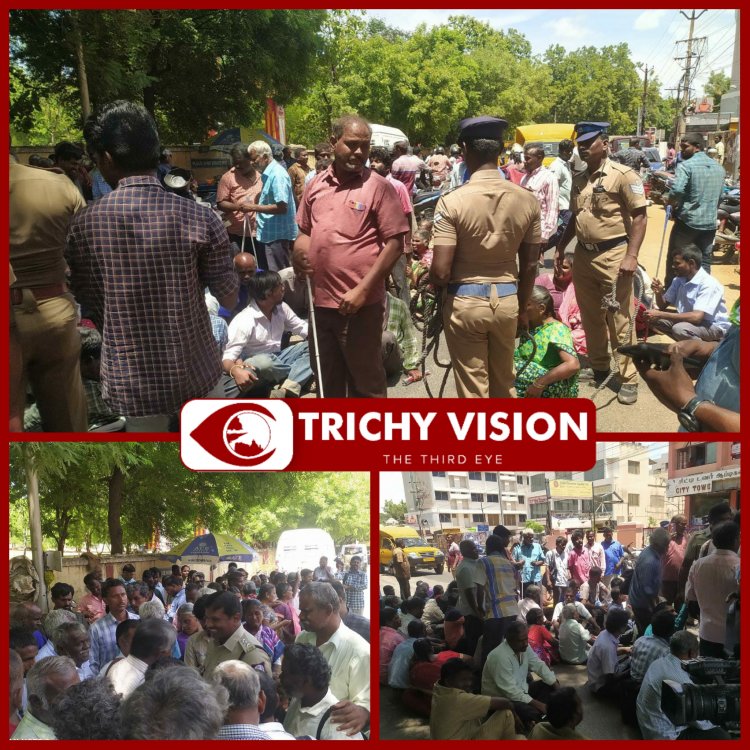 திருச்சி மத்திய பேருந்து நிலையம் அருகே உள்ள ராணுவ கேன்டீன் அருகே பார்வையற்ற மாற்றுத்திறனாளிகள் சாலை மறியல் போராட்டத்தில் திடீரென ஈடுப்பட்டனர்.அரசு தங்களுக்கு மாதம் உதவி தொகை ஆயிரம் ரூபாய் வழங்குவதை 5000 ரூபாயாக உயர்த்தி வழங்க வேண்டும். நலிவுற்ற இசைக்கலைஞர்களுக்கு மாதாந்திர உதவி தொகை வழங்குவது போல் பார்வையற்ற இசைக்கலைஞர்களுக்கும் உதவித்தொகை வழங்கிட வேண்டுமென அரசுக்கு கோரிக்கை பல நாட்களாக வைத்துள்ளோம் என செய்தியாளர்களிடம் தெரிவித்தனர்.
