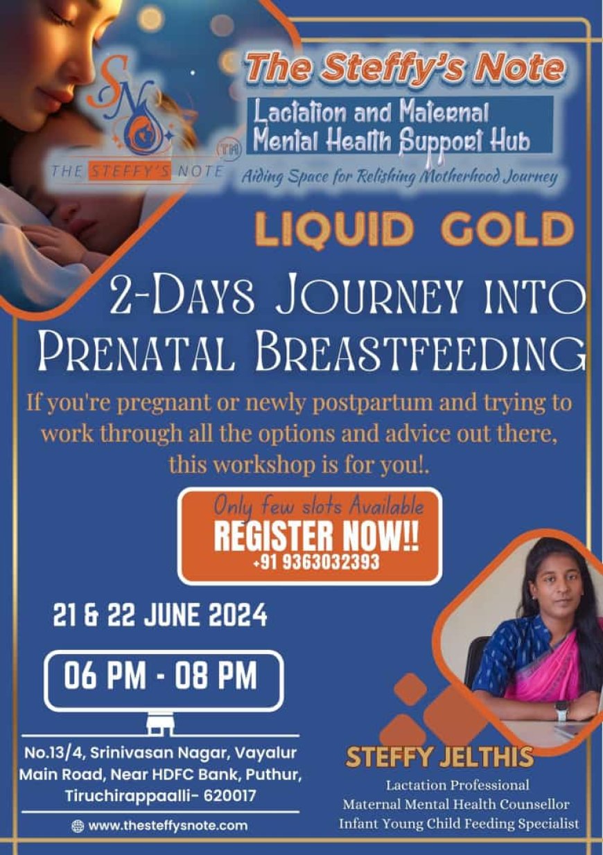 The Steffy’s Note சார்பில் இரண்டு நாட்கள் பயிற்சி வகுப்பு நடைபெற உள்ளது. இதில் பிறந்த குழந்தைகளுக்கு தாய்ப்பால் ஊட்டுதல் மற்றும் குழந்தை பராமரிப்பு உறவுகளும் மனநலம் குறித்த பயிற்சி அளிக்கப்படுகிறது. மேலும் விபரம் மற்றும் தகவலுக்கு கீழே உள்ள படத்தை பார்க்கவும்.