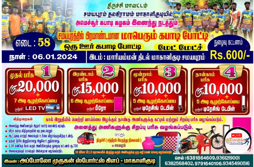 அப்போலோ முருகன் ஸ்போர்ட்ஸ் கிளப் மற்றும் அமெச்சூர் கபாடி கழகம் இணைந்து நடத்தும் மாபெரும் பரிசு கபடி போட்டி திருச்சி மாவட்டம் சமயபுரம் அருகே தலகிராமம் மாகாளிக்குடி மாரியம்மன் கோவில் திடலில் தொடங்கியது. இந்த கபாடி போட்டியில் பங்கேற்பதற்காக திருச்சி மட்டுமில்லாமல் கரூர், புதுக்கோட்டை, தஞ்சாவூர், அரியலூர், பெரம்பலூர் உள்பட பல்வேறு மாவட்டங்களில் 50க்கும் மேற்பட்ட கபாடி குழு வீரர்கள் கலந்துகொண்டு பங்கேற்று வருகிறார்கள்.