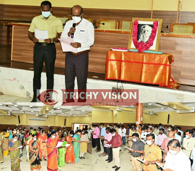 அதன் அடிப்படையில் இன்று (17.09.2021) தந்தை பெரியாரின் 143 ஆவது பிறந்த நாளில் திருச்சிராப்பள்ளி மாவட்ட ஆட்சியரகத்தில் தந்தை பெரியார் அவர்களின் திருவுருவ படத்திற்கு மாவட்ட ஆட்சித்தலைவர் சு.சிவராசு மலர் தூவி மரியாதை செலுத்தி சமூகநீதி நாள் உறுதிமொழியினை வாசித்திட அனைத்து அலுவலர்களும் சமூக நீதி நாள் உறுதிமொழியினை மீண்டும் வாசித்து ஏற்றுக்கொண்டனர்.