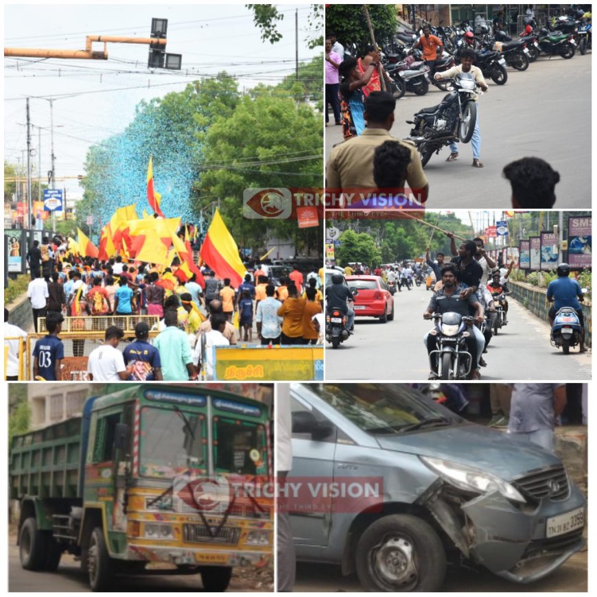 திருச்சி மாவட்டத்தைச் சுற்றியுள்ள பல்வேறு மாவட்டங்களில் இருந்து ஏராளமானவர்கள் முத்தரையர் சிலைக்கு மாலை அணிவித்து மரியாதை செலுத்தி வருகிறனர். இதற்காக இருசக்கர வாகனங்கள் மற்றும் நான்கு சக்கர வாகனங்களில் வருகின்றனர். ஆனால் போக்குவரத்து நெரிசல் ஏற்படாமல் இருக்க போலீசார் பல்வேறு கட்டுபாடுகள் விதித்துள்ளனர். ஆனாலும் இதனை மீறி அதிக வாகனங்களில் அதிக சப்ததுடன் பேரணியாக வருகின்றனர். இதனால் அந்த சாலையில் வந்த லாரி, கார் மீது மோதி விபத்துக்குள்ளானது. இதில் அதிர்ஷ்டவசமாக யாருக்கும் காயம் ஏற்படவில்லை இருப்பினும் கார் சேதமடைந்துள்ளது இந்த முத்திரை சிறை சுற்றி பள்ளிக்கூடம், மருத்துவமனைகள் உள்ளதால் அதிகளவு பொதுமக்கள் வருகை தருகின்றனர். இதன் நலன் கருதியே போக்குவரத்து போலீசார் சில அறிவுரைகளை வழங்கி உள்ளனர். ஆனால் அதையும் மீறி இளைஞர்கள் இருசக்கர வாகனத்தில் அதிக ஒலி எழுப்பிக்கொண்டு பேரணியாக போக்குவரத்து இடையூறு ஏற்படுத்தி வருகின்றனர்.