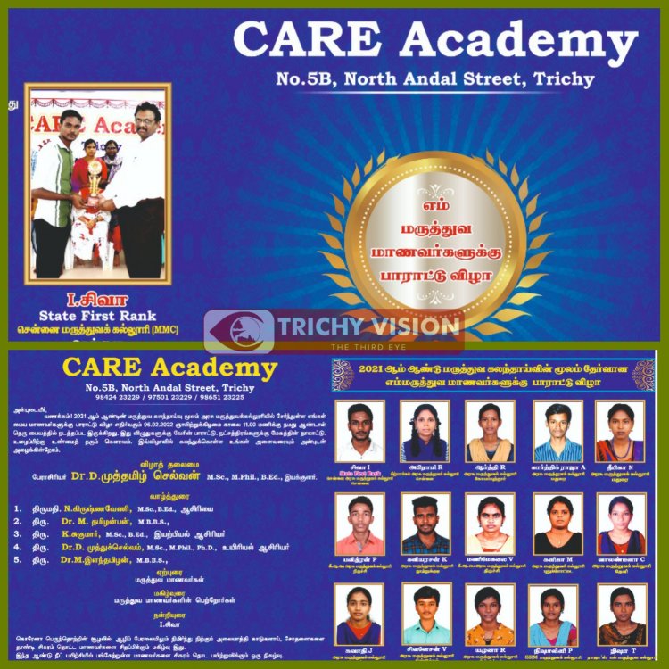 திருச்சி கேர் அகாடமியில் மருத்துவ கலந்தாய்வு மூலம் அரசு மருத்துவ கல்லூரியில் சேர்ந்து உள்ள மாணவர்களுக்கு பாராட்டு விழா நடைபெறுகிறது.நாளை(06.02.2022) காலை ஆண்டாள் தெருவில் உள்ள கேர் பயிற்சி மையத்தில் நடக்கிறது. இது விழுதுகளுக்கு வேரின் பாராட்டு, நட்சத்திரங்களுக்கு மேகத்தின் தாலாட்டு, உழைப்பிற்கு உண்மை தரும் கெளரவம்.