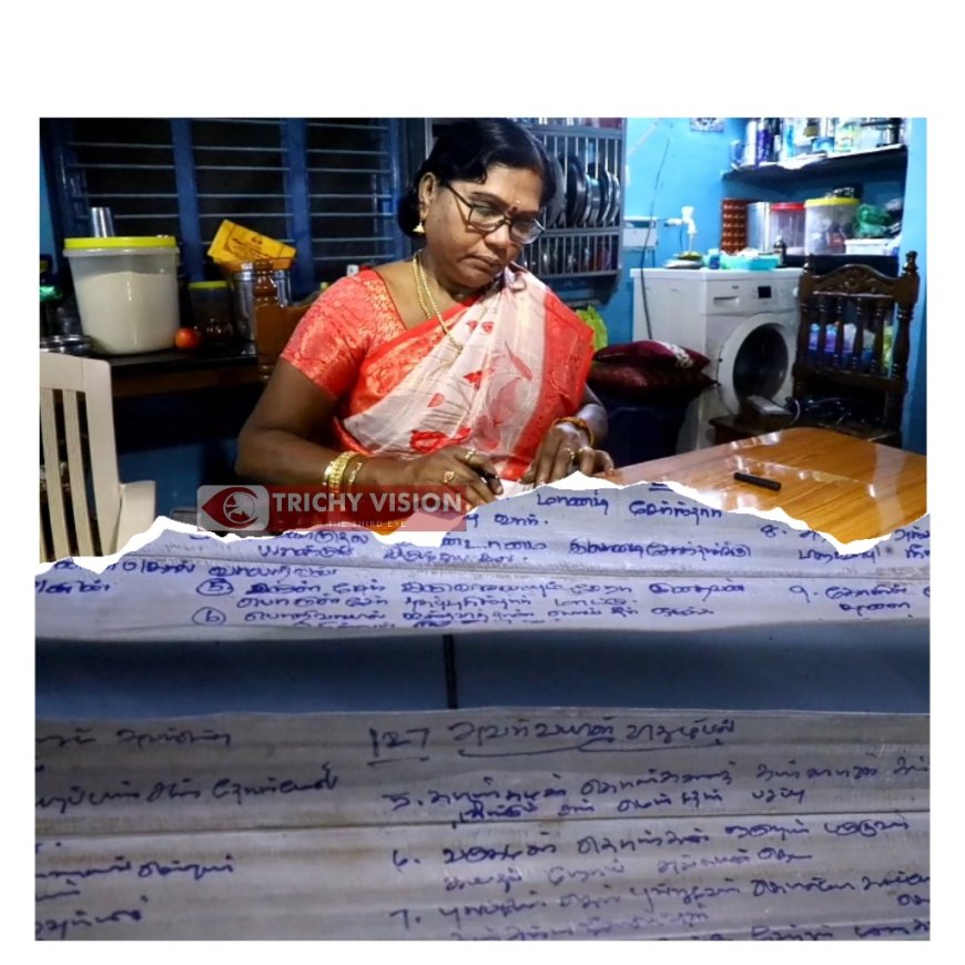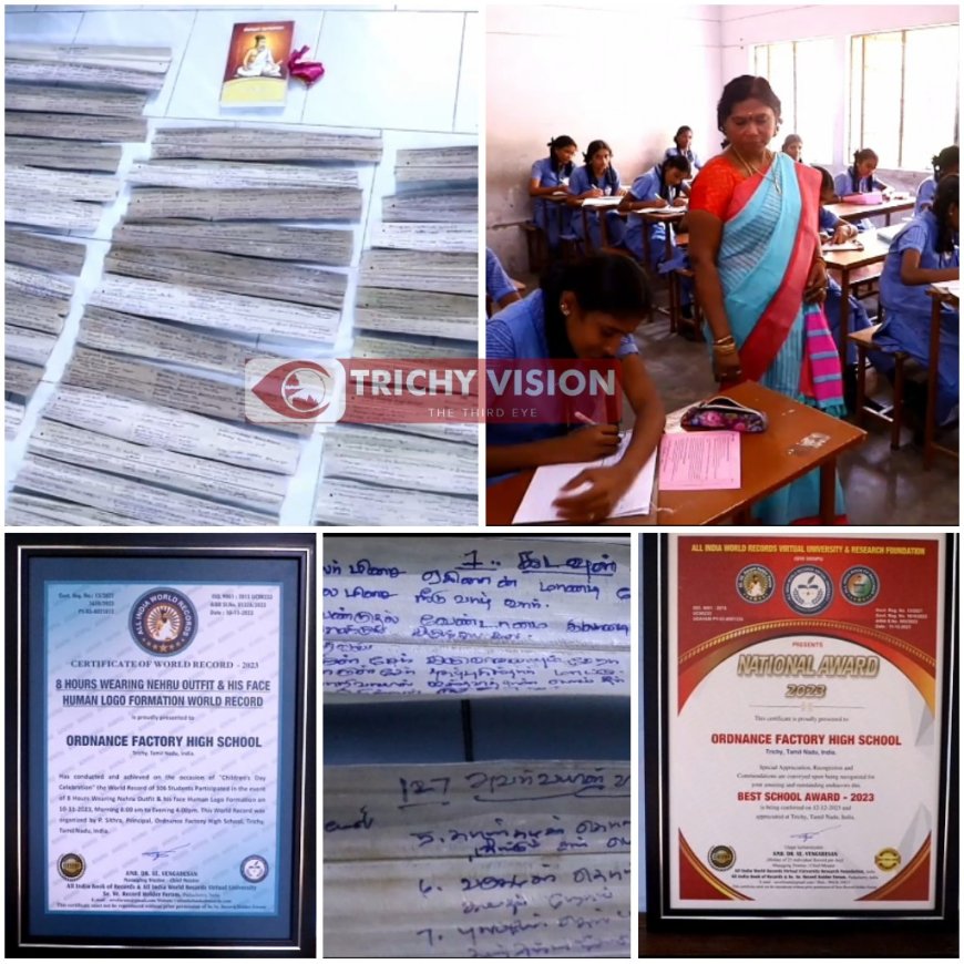 திருச்சி திருவெறும்பூர் அருகே உள்ள துப்பாக்கி தொழிற்சாலை சிபிஎஸ்இ பள்ளி முதல்வர் பெ.சித்ரா இளஞ்செழியன். நேற்று உலகத் தாய்மொழி நாளை முன்னிட்டு 133 பனை ஓலையில்,1330 திருக்குறளை எழுதும் சாதனையை காலை 9:03 மணிக்கு தொடங்கி இடைவிடாது தொடர்ந்து இரவு 10.33 மணிக்கு எழுதி முடித்தார்.