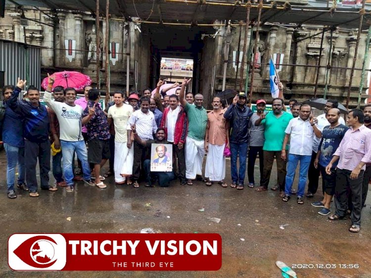 இதன் ஒரு பகுதியாக திருச்சி மாவட்ட ரஜினி ரசிகர்கள் ஸ்ரீரங்கம் ராஜகோபுரம் முன்பு பட்டாசு வெடித்து உற்சாகமாக தங்களது மகிழ்ச்சியை வெளிப்படுத்தினர். மேலும், கொட்டும் மழையில் கொண்டாட்டத்தில் இருந்த ரஜினி ரசிகர்கள் பொதுமக்களுக்கு இனிப்புகளை வழங்கினர். பின்னர் ரஜினி முதல்வர் வாழ்க என்று மகிழ்ச்சியுடன் கோஷமிட்டனர்.