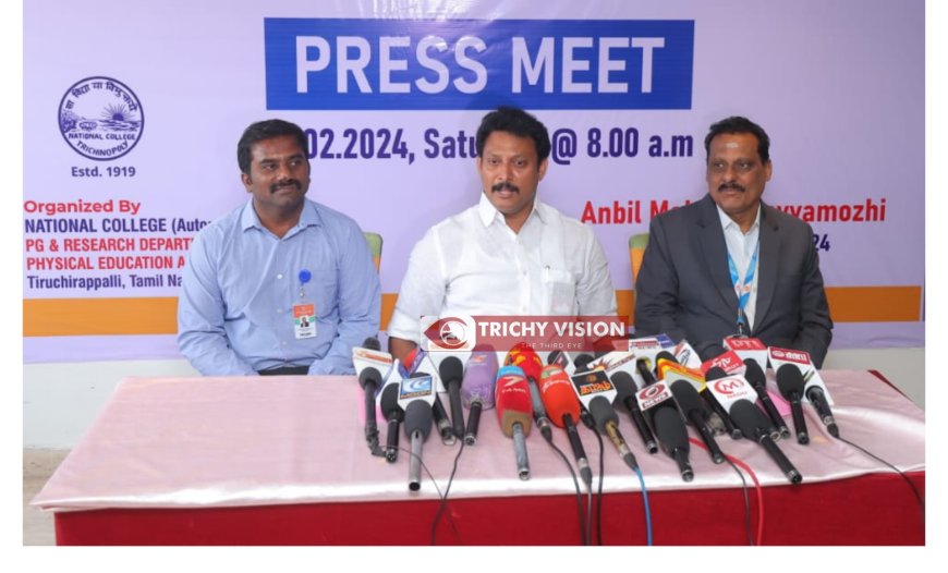 திருச்சி தேசிய கல்லூரியில் வருகின்ற 7ஆம் தேதி தொடங்கி 11 ஆம் தேதி வரை நடைபெற உள்ள 50க்கும் மேற்பட்ட நாடுகளில் இருந்து விளையாட்டு வீரர்கள் பங்கேற்கும் ICRS எனப்படும் பன்னாட்டு கருத்தரங்கம் தொடர்பாக பள்ளி கல்வித்துறை அமைச்சர் அன்பில் மகேஸ் பொய்யாமொழி செய்தியாளர்களை சந்தித்தார்.